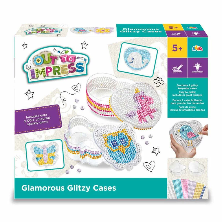 R Exclusive, only available at Toys R Us Canada. Create cute and colourful jewellery cases with Out To Impress Glamorous Glitzy Cases. Playtimes have never been this much fun, you can use the six design templates and 2,000 colourful gems to create amazing looks! Add you own style to these lovely keepsake boxes using the colourful sparkly gems. This adorable set includes both a butterfly and heart case for your little ones to decorate how they like!