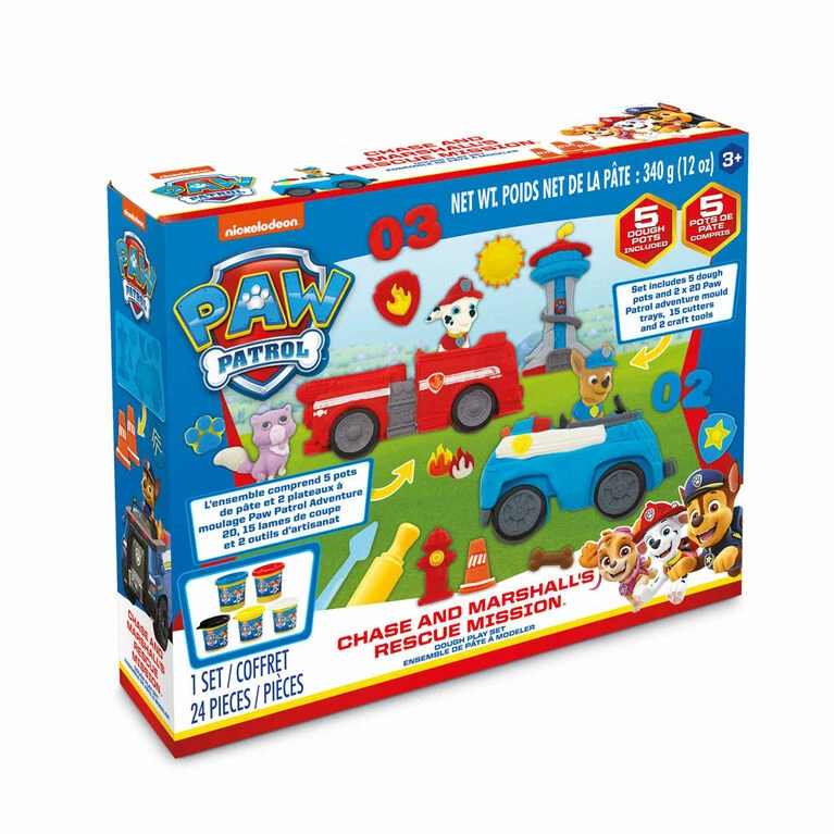 Quick! Mayor Goodway is in trouble! We’ve got to go help her! Chase and Marshall are on it! Children will love creating and moulding their favourite pups and crazy rescue missions with this extensive set. We can make up paw-some stories and mould dough-tastic creations as we fill the PAW Patrol moulds with the colourful dough. Use the tools for the details or create S.O.S messages with the alphabet cutters. We can make and create for hours when playing with dough. This set includes 5 pots of dough, 2 Paw Patrol moulding trays, 26 alphabet cutters and 2 accessories.
