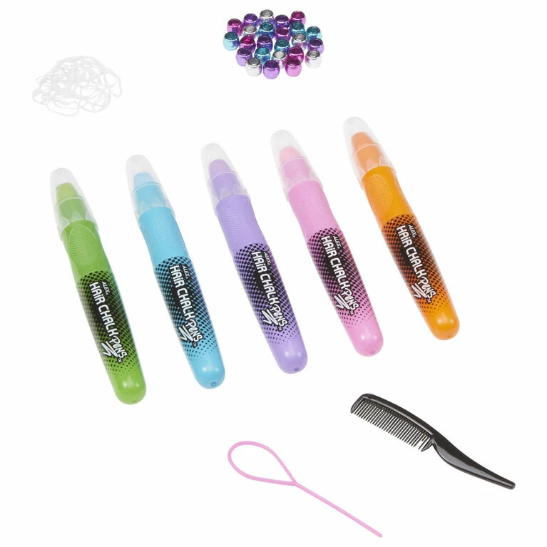 ALEX Spa Hair Chalk Salon lets your diva make her hair as vibrant as her personality! Glide on temporary color and add strands of shimmering beads to do up her do! Hair chalk can be applied to dry hair of any color and washes out easily with shampoo. This kit contains 5 washable hair chalk pens, 24 metallic beads, hair beading tool and 24 hair elastics.ย