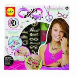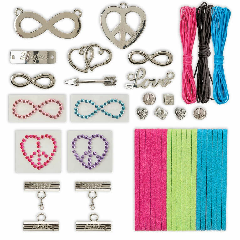 ALEX Toys DIY Wear Infinity Jewelry lets you show your infinite style with luxe charm accessories you make yourself! Create 2 fully-loaded multi-strand bracelets or necklaces with the unique Easy Slide Clasp. Also make 2 necklaces with large silver charms and stick-on jewels. No tools or glue needed! Charms include symbols and words of love, peace and infinity. Includes 4 easy slide clasps, 8 charms, 6 silver beads, 6 suede cords (13.3yds / 12.2m each), 3 colors of twine (3.8yds / 3.5m each), 4 gem stickers and easy instructions.