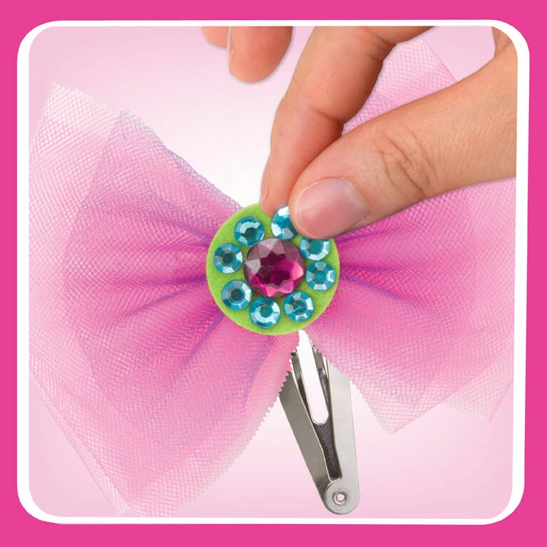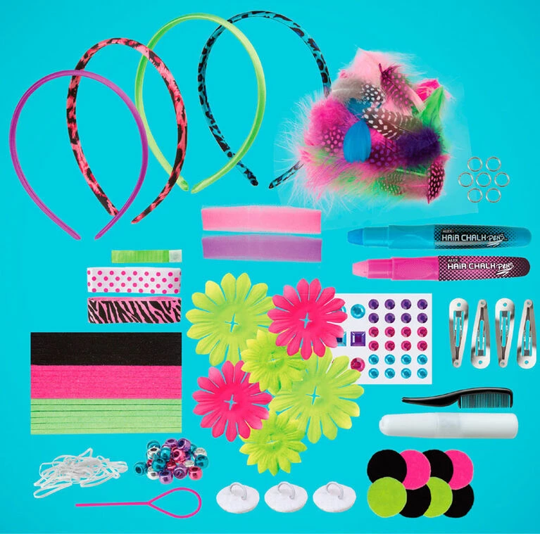 ALEX Spa Ultimate Hair Accessories Salon includes everything your child needs to color, bead and accessorize her hair! Make 8 awesome accessories like headbands and hairclips. Hair chalk pens can be used to add streaks of color and easily wash out later! Great for sleepovers, birthday parties or just a girl’s night in. Includes 4 headbands, 4 barrettes, 2 washable hair chalk pens (0.2oz.), 3 cords (24in.), 15 feathers, 30 sticky gems, 12 beads, 6 fabric flowers, 8 pieces of sticky felt, 8 hair elastics, beading tool, comb, 7 jump rings, tulle (10.8in. x 6in.), ribbon (7.9in.), easy-attach ribbon strap, glue (0.2oz.) and easy instructions. Recommended for children 8 years of age and older.