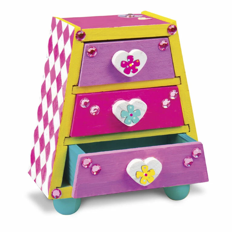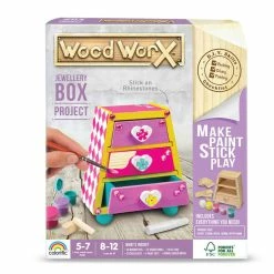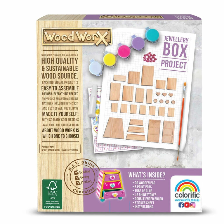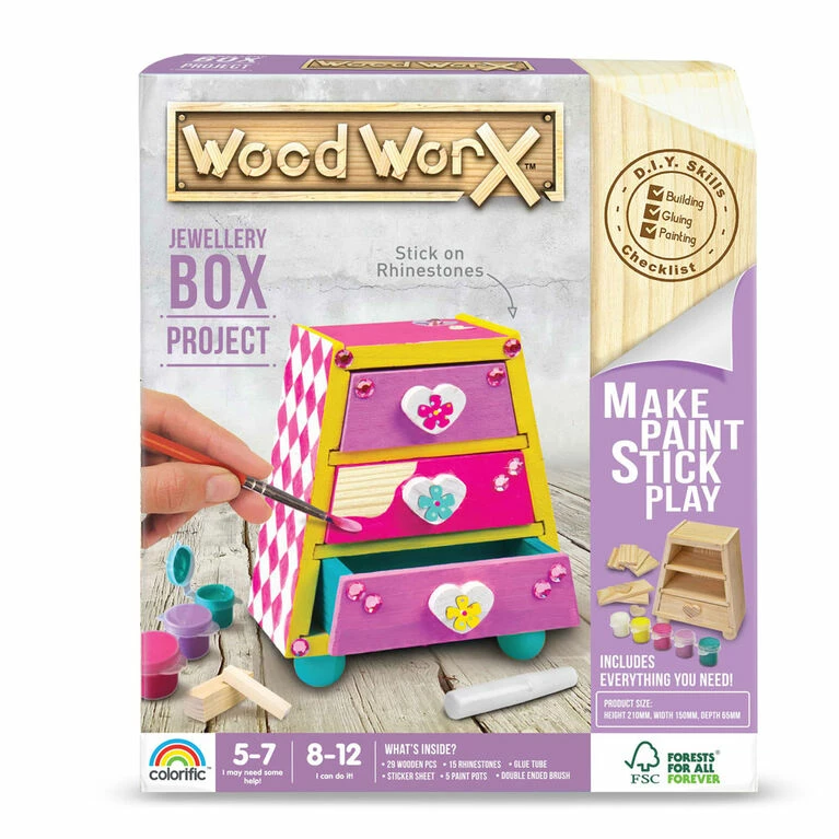 Display all your sparkly bracelets and precious best friend charms with the Wood WorX Jewellery Box. This lovely Jewellery Box has three pretty drawers of different sizes – perfect for everything from dainty rings to treasured necklaces. Each kit comes complete with all the pieces you need to create your own beautiful box – including easy to assemble wooden pieces, colourful paints and pretty decorating pieces. The Wood WorX range is produced with FSC certified wood.