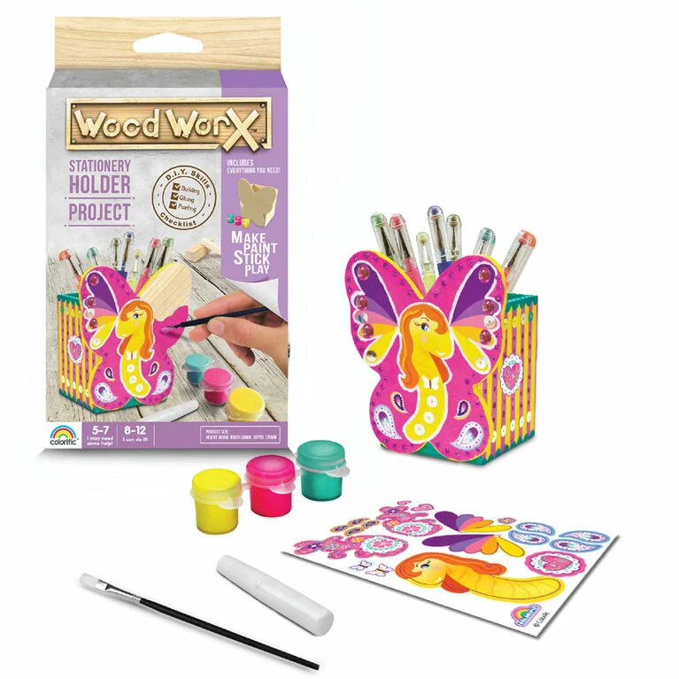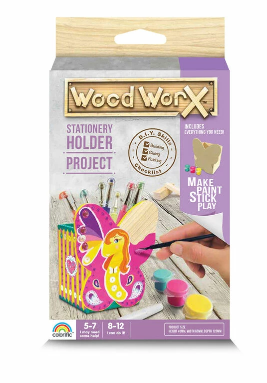 Build, paint, stick and play! The Wood WorX classic craft activity is now in miniature form for more fun! The kit includes, wooden pieces, paint pots, a tube of glue, a small paint brush, a sticker sheet and instructions. Everything you need to make your own Mini Stationery Holder! The Wood WorX range is produced with FSC certified wood.