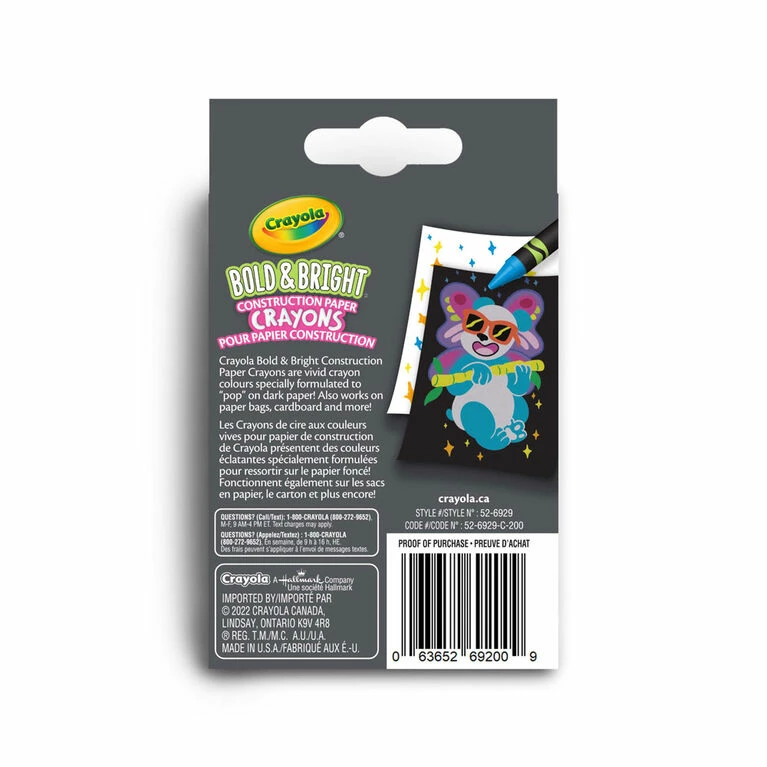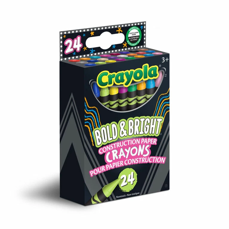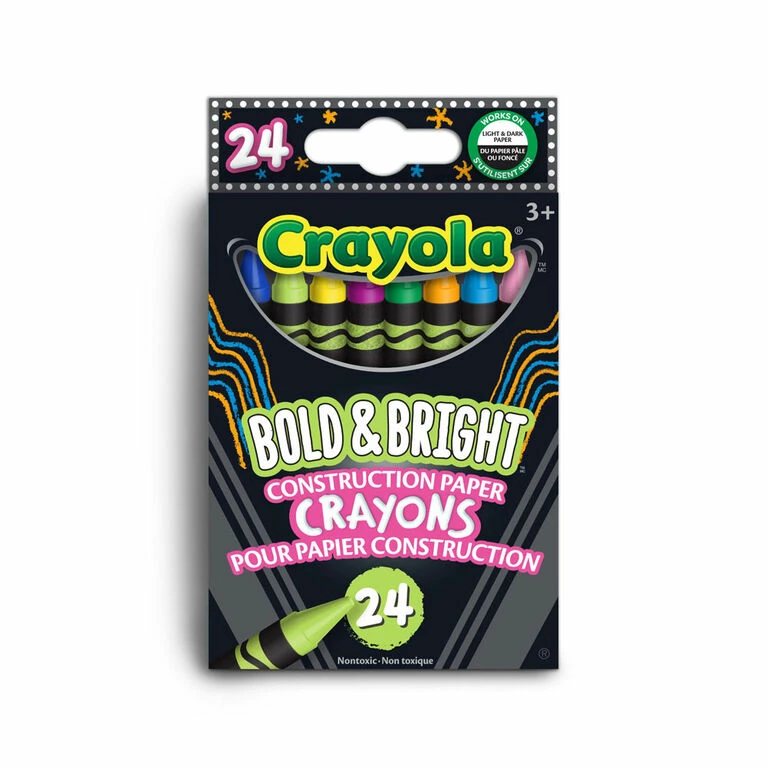 Crayola Bold and Bright Construction Paper Crayons make colouring on coloured craft paper a breeze! Kids will love finally seeing their works of art pop, no matter what backdrop they choose. This set of art tools features 24 vibrant, creamy crayons in both primary and secondary colours. Bold and bright tones give children a rainbow of hues to choose from. Unique formula produces extra bold results, these crayons appear on construction paper, paper bags, cardboard, and more! Pair with a pack of Crayola Construction Paper (sold separately) for a great bundled gift for kids. Safe and nontoxic, ideal for ages 3 and up.