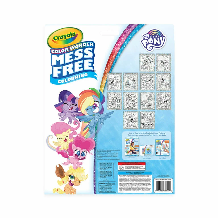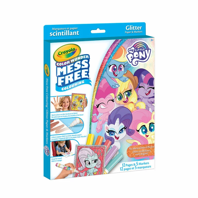 Glam it up with My Little Pony! Color Wonder mess-free glitter paper offers all the fun of glitter with none of the mess because the glitter effects are built into the paper. Just use the clear Color Wonder markers to create a colourful, shimmering masterpiece! And just like all Mess-Free Color Wonder products, the markers won’t colour on skin, furniture or carpets. Its mess-free nature makes it an ideal art activity for on-the-go colouring or anywhere mess can be a concern. This kit includes an 12 page Color Wonder glitter paper colouring book featuring your favourite My Little Pony characters and 5 Color Wonder markers.