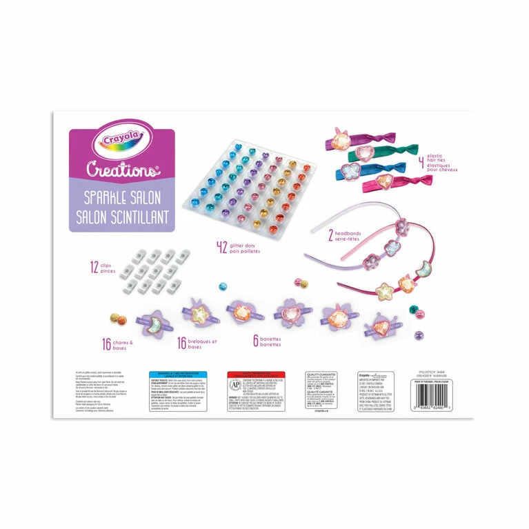 With the Crayola Creations Sparkle Salon kids can “squish to create” colourful, sparkly and wearable hair accessories! Using 8 fun charm designs with interchangeable clips, young salon stylists can mix and match for custom designs across the featured hair accessories! Get creative! The set encourages kids to express themselves with these easy-yet-beautiful crafts! The Creations Sparkle Salon features 42 Glitter Dots, 16 Charms, 12 Clips, 6 Barrettes, 4 Hair Bands, 2 Headbands and 1 Instruction Sheet. This D.I.Y. set is perfect for ages 6 and up. Makes a wonderful gift for girls and boys who have a style all their own!