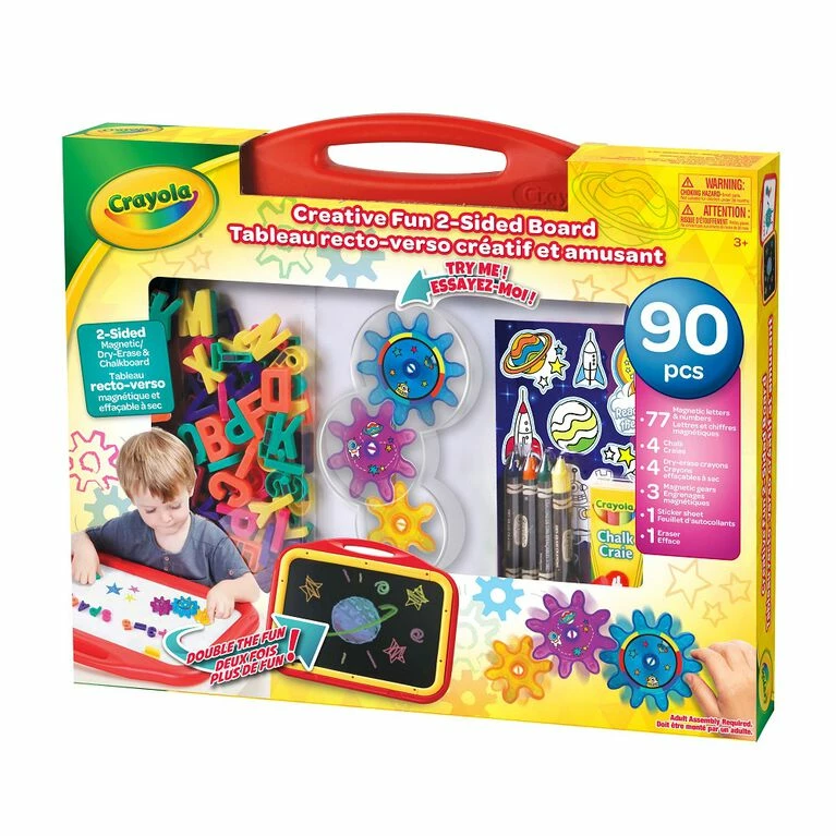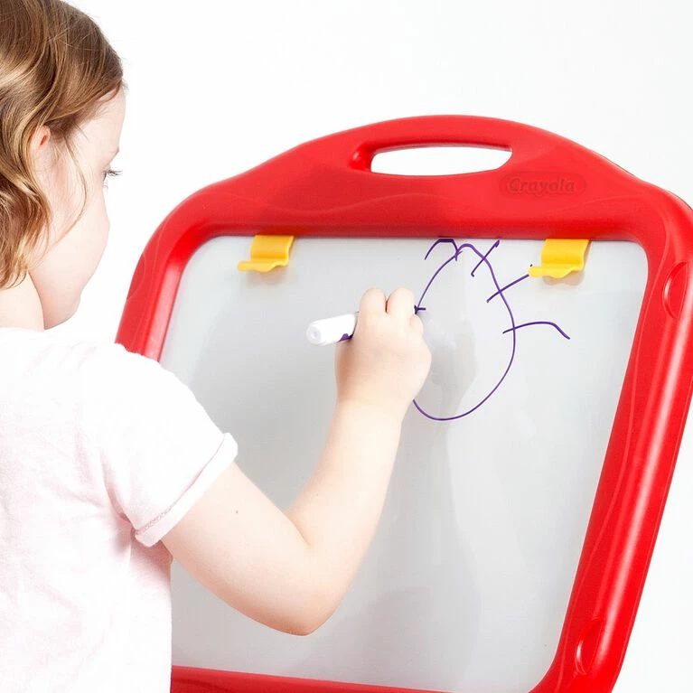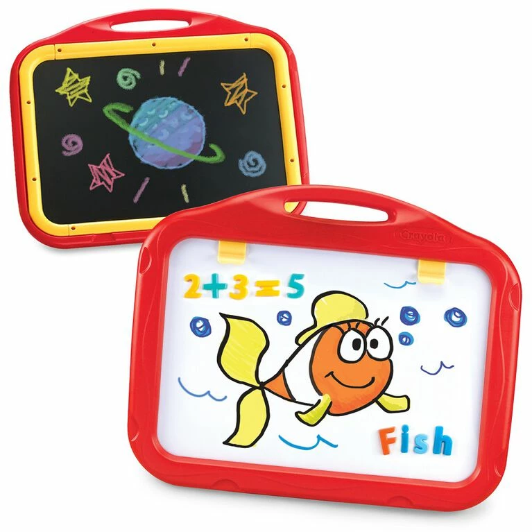 It’s a two-sided portable drawing board with one magnetic dry-erase board and one chalkboard . This set come with 4 chalks and 4 washable dry-erase crayons encouraging kids to create their artwork without limitation.