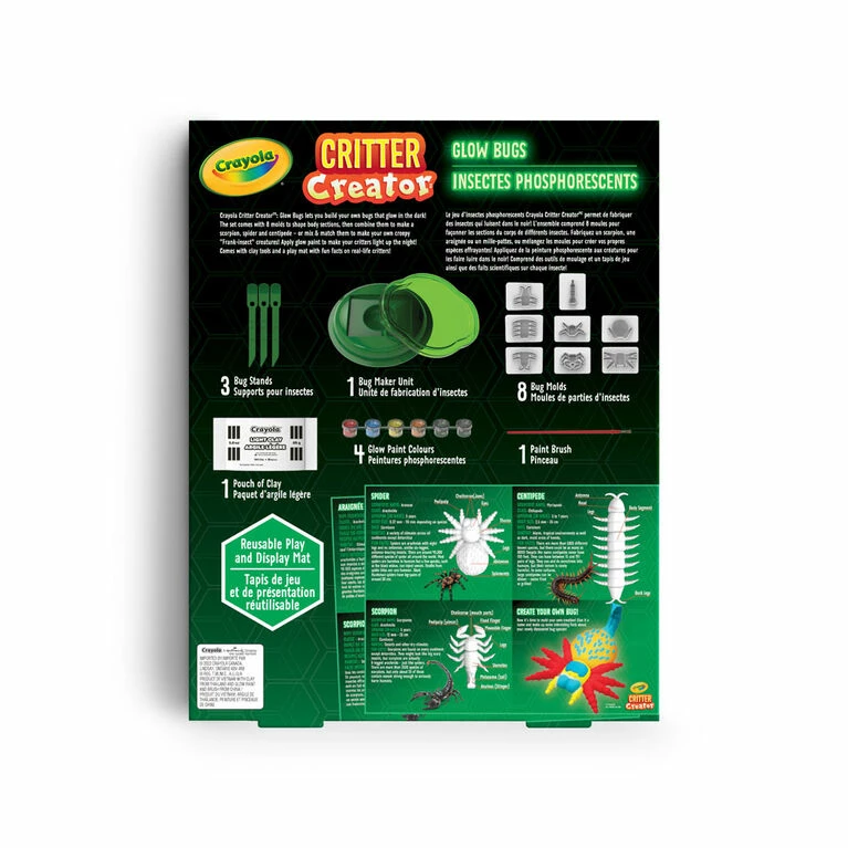 Get ready to bug out! Kids who can’t get enough of creepy-crawlers will have a blast playing with our Crayola Critter Creator Glow Bugs kit. This build-a-bug art set allows kids to use modeling clay and eight molds to make super-detailed scorpions, spiders, and centipedes. Or they can get extra creative by mixing and matching bug body parts to make their own one-of-a-kind bug! Best of all, this craft kit comes with specialty glow paint that makes the bug creations glow in the dark. This kit helps kids exercise their STEAM skills, while also boosting their confidence and creativity – an included playmat with bug FAQs and bug stands encourage them to show off their gnat-sterpieces!
