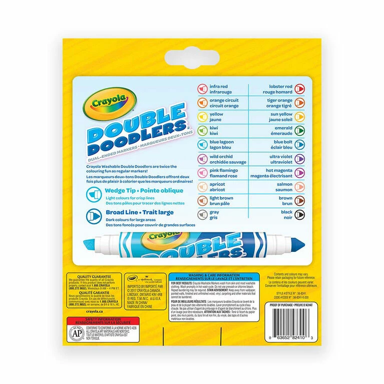 Crayola Double Doodler Markers are double the fun! Each marker comes with two complimentary colours for a total of 20 colours. Each marker is dual-ended featuring a broad line tip marker on one end and a wedge tip marker on the other end to provide just the right amount of colour for large or small spaces. These markers lay down plenty of colour and won’t smudge or bleed through paper. Unleash creativity and amp up school projects and artistic endeavours with vibrant high-quality ink that is true to colour. With these markers children can express, create, and connect with colour. Watch kids’ confidence and independence grow as they learn through colourful play.