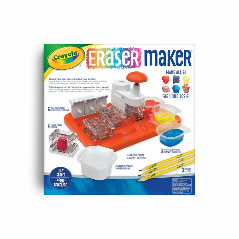 Why does the pointy end of the pencil get to have all the creative fun? With the Crayola Eraser Maker it’s easy for kids to mix and mold their own colourful, whimsically themed eraser figures! Just follow the step-by-step instructions and in no time kids can go back to school with cool, colourful erasers to customize the tops of their pencils. This set includes the Eraser Making Unit, 6 Eraser Making Molds, Eraser Making Solution, 3 No. 2 Crayola Pencils, and an Instruction Booklet. The Eraser Maker is an innovative and creative toy that makes a great gift for kids ages 8 and up.