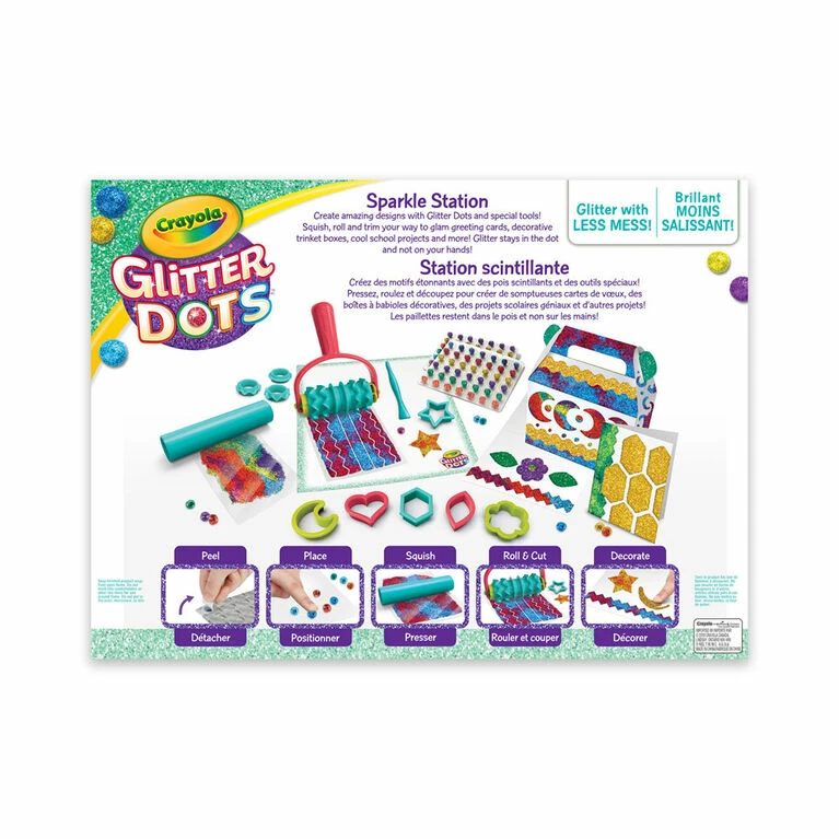 Crayola Glitter Dots offer fun glitter play in a less messy way! The glitter is contained in each dot–no spills and sticky glue! Create amazing designs with the Crayola Glitter Dots Sparkle Station. Squish; roll and trim your way to glam greeting cards; decorative trinket boxes; cool school projects and more! Kids can experiment with adding their Glitter Dots to paper; wood; felt; papier-mΓ’chΓ©; fabrics; foam board and more. Glitter stays in the dot and not on your hands. This set includes a collection of art tools for kids; providing a number of fun ways to apply Glitter Dots. This set includes 84 Glitter Dots; 3 Note Cards; Flat Hand Roller; Roller Tool with 9 Cutting Wheels; 6 Shape Cutters; Clay Tool; Trinket Cardstock Box; 2 Clear Roller Sheets; Work Mat & Instructions. Makes a great gift for creative and crafty girls and boys. Safe for ages 5 & up!