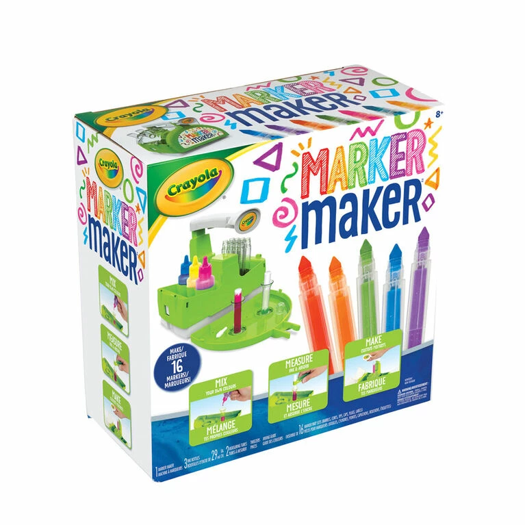 R Exclusive, only available at Toys R Us Canada. Create your own custom markers in minutes with the Crayola Marker Maker! Use the mixing guide to create your colours-or make up your own for a creative marker making experience! Watch as the marker core magically draws in the ink, and then click it together to finish your own custom marker! The Crayola Marker Maker includes everything you need to make 16 custom markers: 3 ink bottles, 1 marker maker, 2 measuring tubes, tweezers, 16 Broad Line marker components and instructions.
