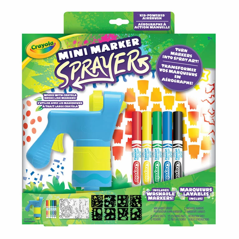 Get ready for an explosion of colour with the Crayola Mini Marker Sprayer! Kid-powered spray art is a fun way to encourage self-expression and creativity. This set features 5 Washable Markers and can work with any Crayola full-size or Pip Squeaks Markers at home, ensuring that colours consistently wash cleanly from skin and washable clothing. This Crayola Air Marker Sprayer is designed to fit comfortably in small hands, with a manual pump that doesn’t require any batteries! Perfect for a birthday or holiday gift for kids, this unit is safe for ages 6 and up. Additional accessories include 2 Stencil Sheets and 10 Blank Sheets so that kids have the tools to get started right away.