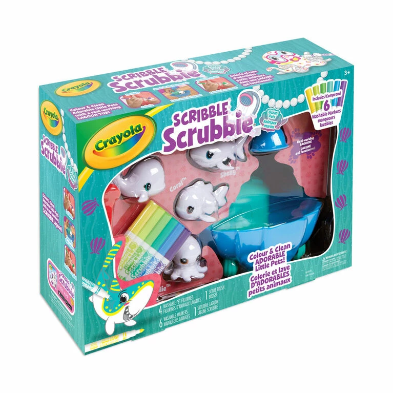Head off the beaten bath and dive into adventure with the Crayola Scribble Scrubbie Pets Lagoon Playset! This fun toy for boys and girls features 4 Animal Figurines, 6 Washable Markers, 1 Scrub Brush, and a Blue Lagoon Tub. Young explorers will love adding unique designs to their crew with a slew of Crayola colours! Critters include a Shark, Octopus, Whale, and Clown Fish. When they’re ready for something new, they can POP ’em in the lagoon and use the kid-powered shower to rinse their fuzzy friends in style! For more washable fun, grow your kiddos Scribble Scrubbie squad with additional sets (sold separately). Makes a great gift for kids ages 3 and up.