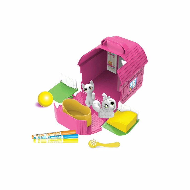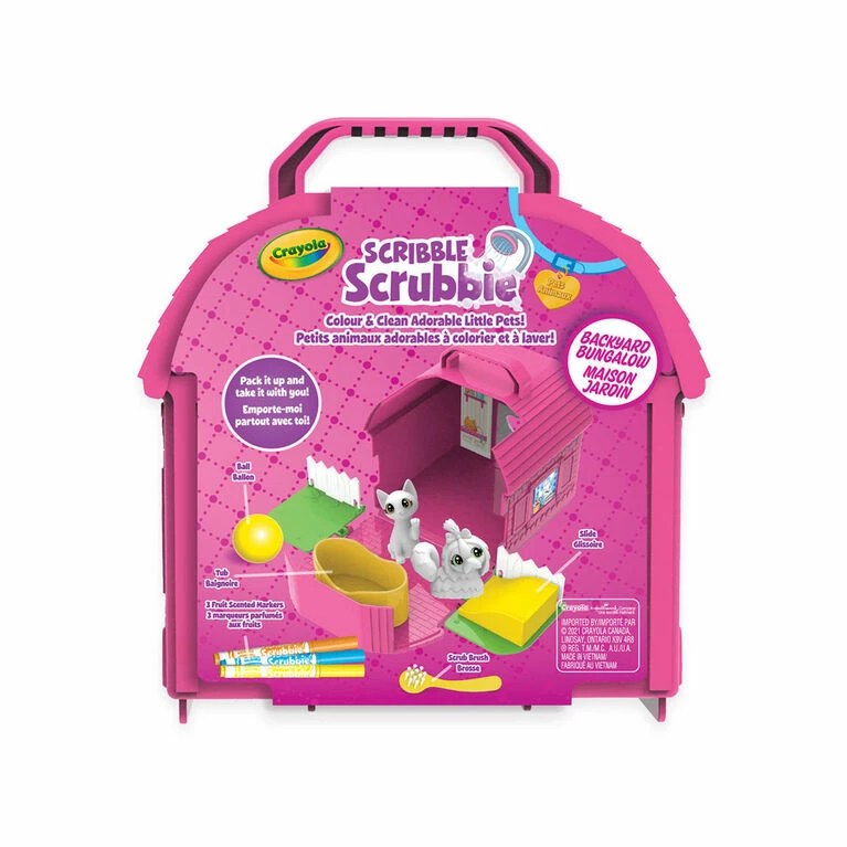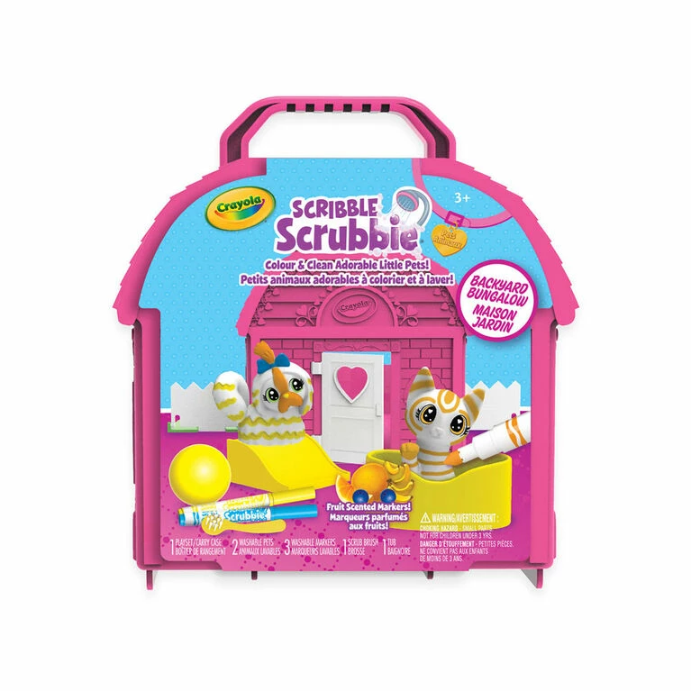 Give your miniature pets the perfect play space with the Crayola Scribble Scrubbie Backyard Bungalow! Take these adorable toy pets “outside” for an afternoon of colourful fun! Crayola Scribble Scrubbie Pets are adorable, colourable and washable pet figures that can be customized again and again! When you’re ready for something new, pop ’em in the scrub tub to get cleaned up. Grow your pet collection with additional Scribble Scrubbie expansion packs (sold separately). This backyard playset includes 2 Scribble Scrubbie Pets, 1 Tub, 1 Scrub Brush, 3 Washable Markers and 1 Pet House that doubles as a storage solution. This set makes a great gift for girls and boys!