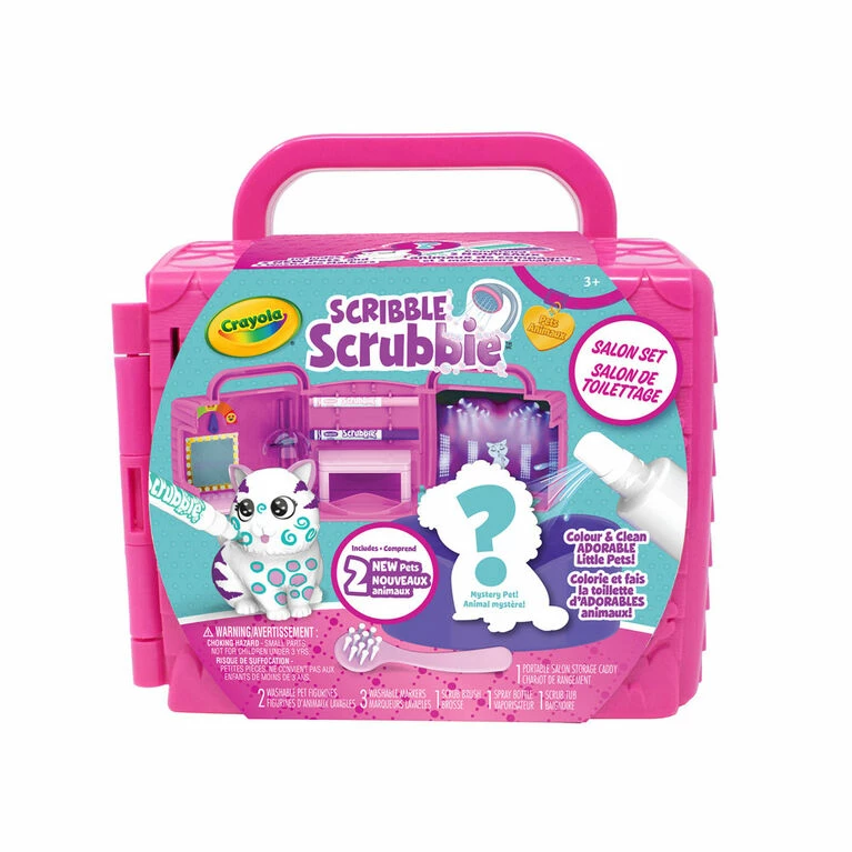 The Crayola Scribble Scrubbie Pets Beauty Salon lets kids address the grooming needs of their Scribble Scrubbie Pets and colour and clean them as well! Kids can set up this compact and portable salon wherever they go. When the visit is over just fold up shop and be on your way! Crayola Scribble Scrubbie Pets are adorable;colourable and washable pet figures that can be customized again and again! When you’re ready for something new;pop ’em in the scrub tub to get cleaned up. Comes with 3 Scribble Scrubbie Markers and 2 Scribble Scrubbie Pets. Also includes a spray bottle;scrub brush;scrub tub and portable salon storage caddy.