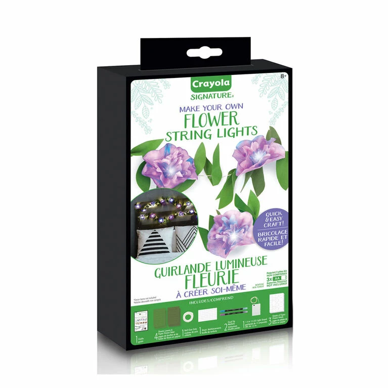 Crayola Signature Flower String Lights are the perfect DIY project to brighten up any space with colourful accent lighting. Follow the easy-to-use guide to design a beautiful illuminated flower garland for home, office or an upcoming party in 60 minutes or less! This kit includes one LED light strand with battery box (13 lights), 3 sheets of flower petal paper, 4 sheets of leaf cardstock, 2 Signature Dual-Ended Sketch & Detail Markers, glue dots, reinforcements and instruction guide, 3 AA batteries required (not included). This kit makes a great gift for adults and teens, and recommended for ages 8 and up.