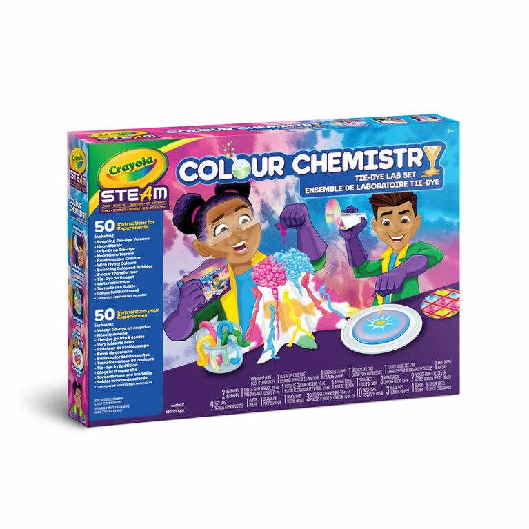 Crayola Colour Chemistry just went Tie Dye! This specially designed edition of the popular Colour Chemistry Sets from Crayola embraces playful experiments with tie dye colours. This educational toy and learning activity set includes exciting science experiments such as Drip Drop Tie Dye, Neon Crayon Erupting Volcano, Kaleidoscope Creator, Neon Mosaic, Tie Dye Shockwave, and more! Nurture a child’s love of STEAM with this kids chemistry set that utilizes common household items to create kids science experiments at home. Kids will become engaged with this chemistry set that includes easy-to-follow, full-colour instructions. Adult supervision is recommended, but these tie dye projects were designed for ages 7 and up. Looking for educational toys that teach and are fun to use? This is the perfect kids science experiment for learning and leisure.