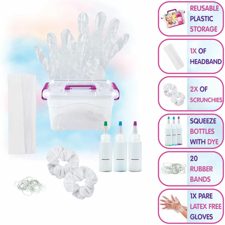 Become a Tie Dye expert without the mess! Not only have we included all the tools and dye needed, we have even included two scrunchies and a headband ready to be tie dyed. Mom’s will appreciate the fact that the dye is pre-measured in the squeeze bottles, just add water and you are ready to go. Re-useable storage container keeps everything neat and tidy. Incudes one headband and two scrunchies. 3 plastic squeeze bottles of dye colors (no mess just ad water!) Rubber Bands .Non-latex gloves. Perfect plastic keeper caddy to store your supplies. Full instructions and inspiration guide teaches you the basics and more.