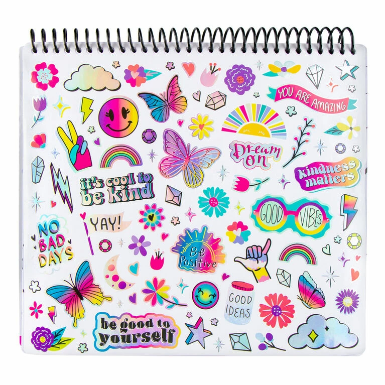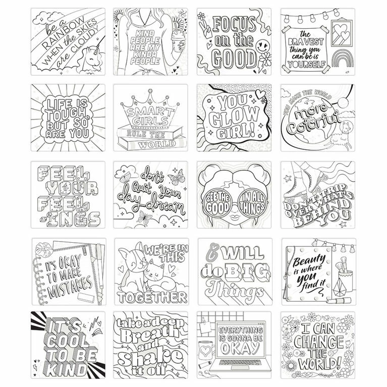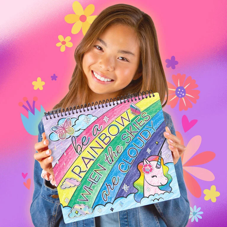 Let kids change the world with this 20-poster colouring set. Each poster contains an original design poster that states messages of kindness and positivity. All posters are printed on cardstock with holographic foil embellishments. Remove the posters from the spiral bound portfolio, place in your windows and watch the smiles on the faces of those passing by.