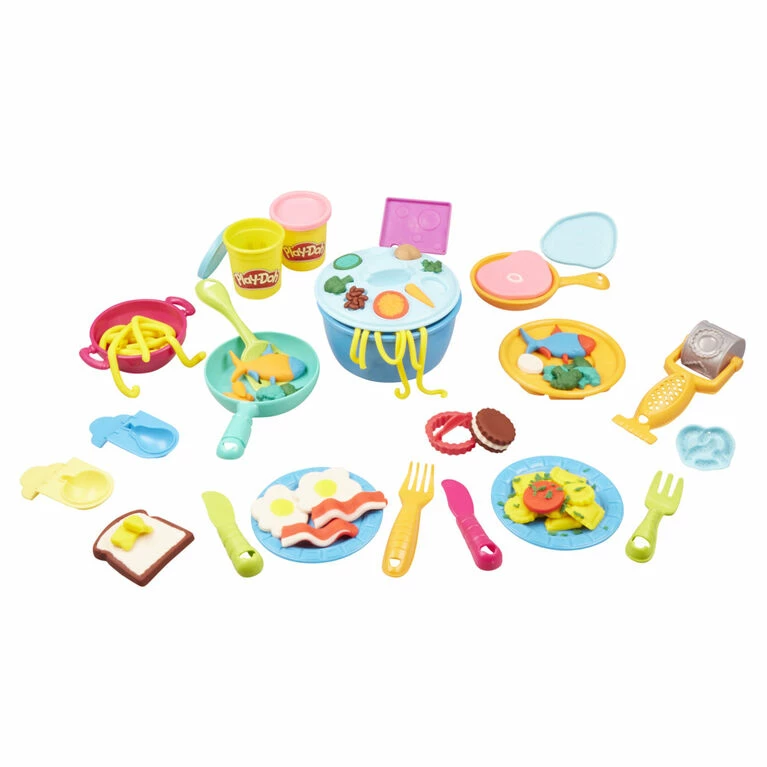 Includes 4 cutters, 4 fruit stampers, 9 food stampers, 2 skillets, saucepan, rolling stamper, garlic press, tongs, pizza cutter, extruder with rail, container with lid, roller, scissors, 3 plates, spatula, 3 forks, 3 knives, and 10 cans of Play-Doh Brand Modeling Compound (30 ounces/840 g total).