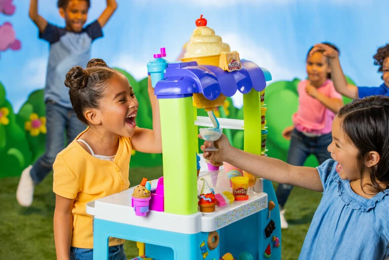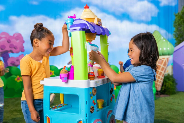 Turn your play space into the ultimate Play-Doh ice cream truck party! This life size kitchen set gives kids a big space to express their big imaginations. Create so many pretend treats with the 27 tools and soft-serve station, customize the creations with the Play-Doh sprinkle maker, tools, and pretend candy molds, and check out customers at the register. Fun music and cash register sounds make kids feel like they’re really running their own ice cream truck. 12 cans of Play-Doh modeling compound give them all the colors they need to get started. The toy food truck was also designed with parents in mind with lots of storage and easy ways to clean up when the fun is done for the day!