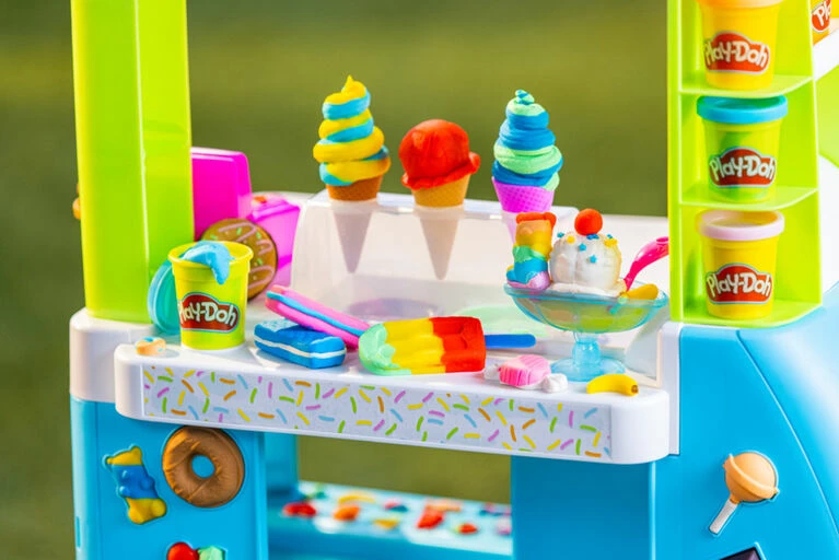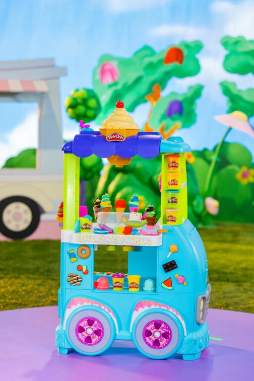 Includes ice cream truck playset, 2 ice cream scoop molds, ice cream sandwich mold, 4 dishes, 6 cones, ice pop mold, 2 ice pop sticks, credit card mold, 2 rollers, scoop, decorating tool, knife, 3 spoons, cleaning brush, empty can, and 12 cans of Play-Doh Brand Modeling Compound (net weight 28 oz/794 g).