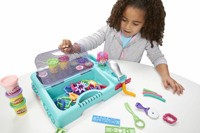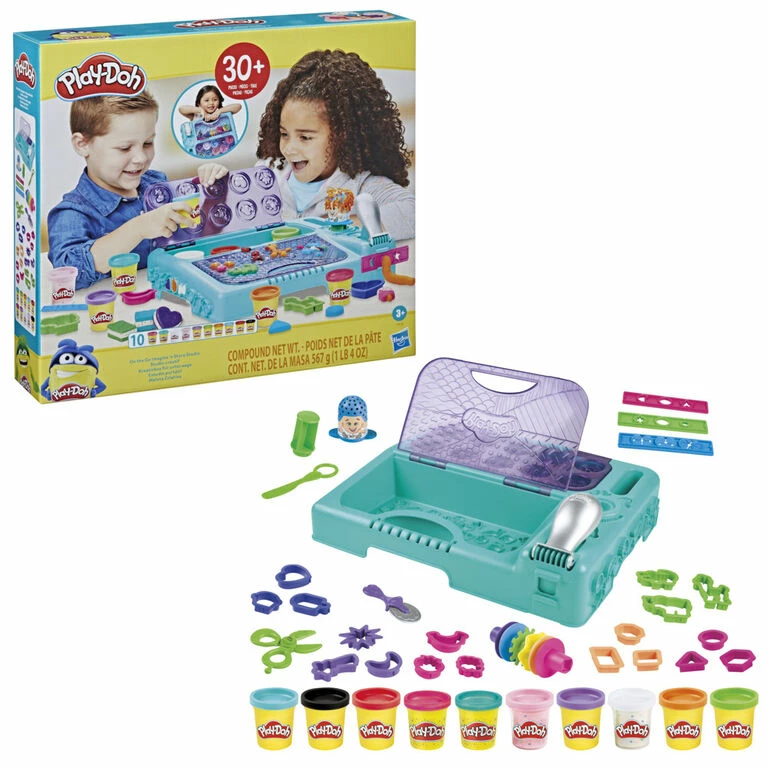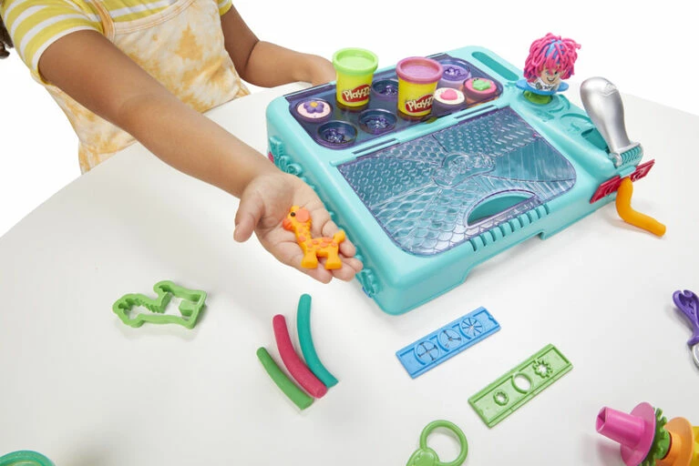 It’s Play-Doh fun on the run! The Play-Doh On the Go Imagine and Store Studio gives kids their own place to get creative. The kid-friendly carrying case stores everything that comes with the set, and it features 2 built-in, classic Play-Doh toys – the Fun Factory tool squeezes out 9 different star and moon shapes, while the Fuzzy Pumper tool makes silly Play-Doh hair! Includes more than 30 cool tools, plus 10 colorful 2-ounce Play-Doh cans including 2 cans of pink and white Confetti compound and 2 cans of red and green Sparkle compound. With so many ways to get creative, this arts and crafts toy for kids 3 years and up gives them everything they need for lots of imaginative playtime fun!