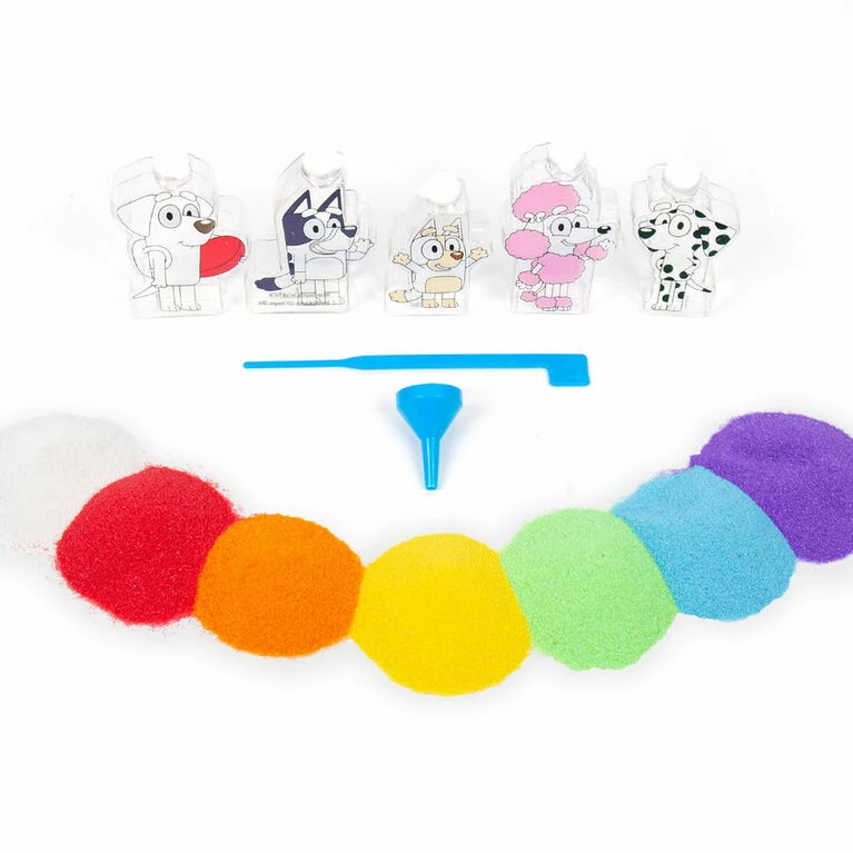 Discover a whole new way to get creative and use your paws to create your own Bluey Sand Art! Bluey, Bingo, Coco, Lucky, Chloe – choose between 5 different fun-shaped bottles of your favorite cast of characters to fill with a rainbow of colorful sands! Place the included funnel inside the bottle to layer 7 different sand colors inside, without making a mess, then get creative! Use the design tool to create multicolored effects or tie-dye patterns while you explore vibrant color schemes! Whether you’re looking for a screen-free activity for a rainy day or a fun birthday party idea, the Bluey Sand Art set offers a pawsome opportunity for little pups ages 6 and up to learn, grow, and have fun through play!