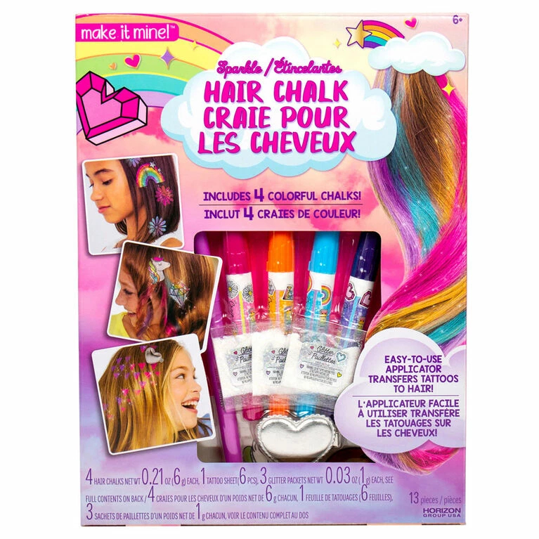 R Exclusive, only available at Toys R Us Canada. From vibrant chalks to stylish stencils and glitter – make your hair as stylish as you are with Sparkle Hair Chalk from Make it Mine! Complete with 4 vibrant hair chalks, 2 stencil sheets, hair tattoos, and a cute, heart-shaped hair clip, this stylish activity kit has everything you need for a full hair makeover! Add bright streaks of pink, purple, orange, or teal color to your hair with the vibrant chalks – follow the easy-to-understand instructions to learn how to create ombré or tie-dye designs! For the perfect design every time, use the stencil sheet to trace trendy graphics onto your hair, like diamonds, hearts, or flowers – or rock a temporary tattoo designed exclusively for your hair! Finish your look with a heart-shaped hair clip and sprinkle on some sparkle for a little something extra! Use hairspray from home to keep the colors vibrant, and whenever you’re ready to create a new look, simply brush out the color and wash your hair!
