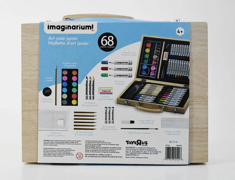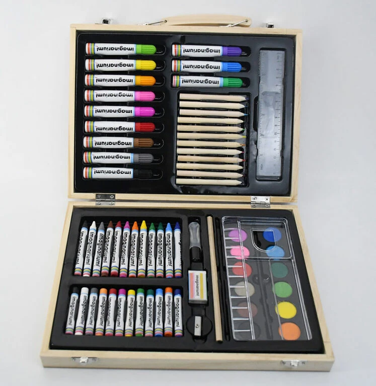 includes 1 wooden art case junior with 12 cryons,12 markers,12 colored pencils, 12 oil pastels,12 water colors,1 sharpener,1 pencil,1 eraser,1 glue,1 paint brush ,1 ruler .