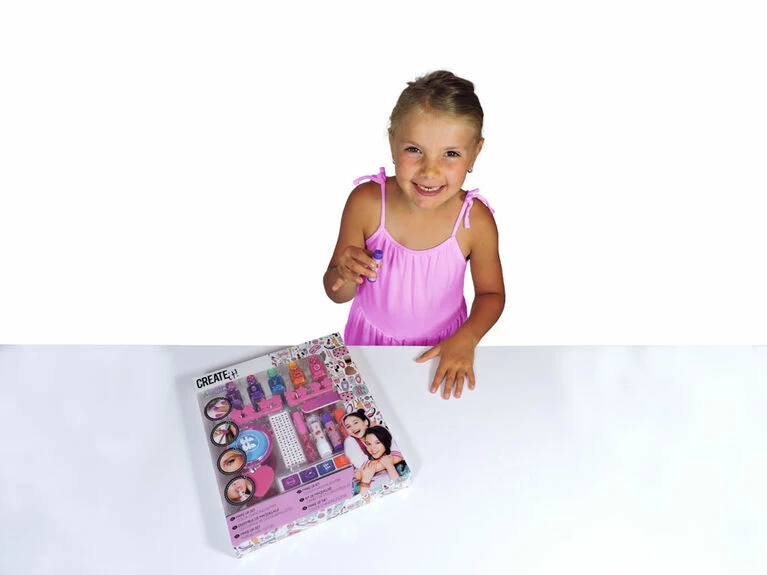 The create It! Make-up set is a must have for every girl that wants to create bold looks! This make-up set has colour changing nail polish, bright coloured eye shadow, mascara, lipstick, lip-gloss and hair chalk. This set also includes all the tools you need to apply your make-up, like a file and toe spreader for your nails, brushes for your eye shadow. With this set of make-up, you can create your own bold and unique style just how you want it.