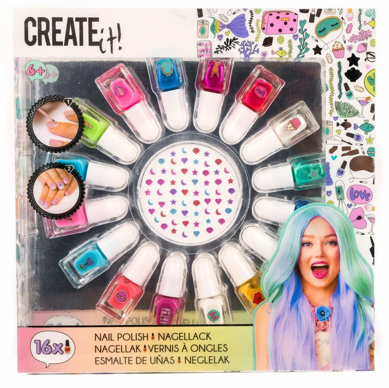 Never wonder which colour to pick for your nails with this nail polish set by Create It!. With 16 different colours you can always match your nails to your bold look. Use the nail art stickers to give your nails the finishing touch.