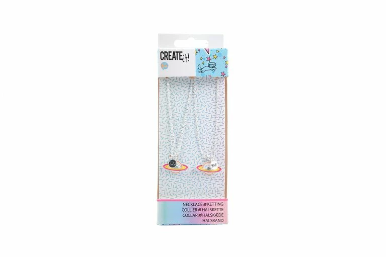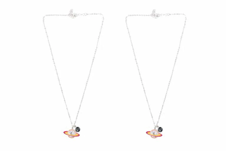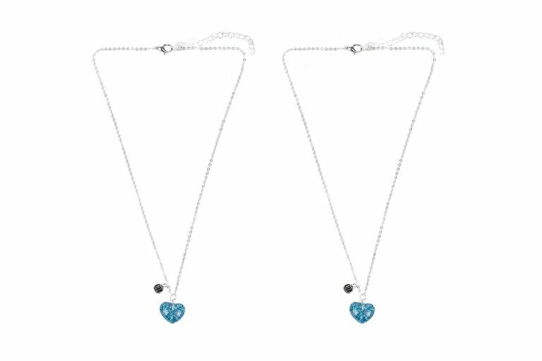 The necklaces come in pares of two, the blue glitter hearts with a silver BFF dangle or the planets with a silver BFF dangle.