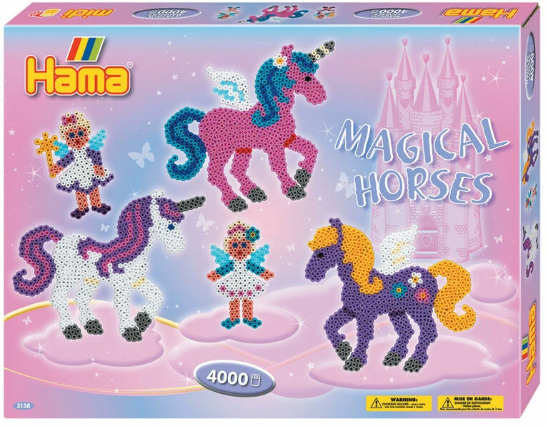 This Hama gift box includes pproximately 4.000 beads, 2 pegboards: Large hexagonal No. 276 and fantasy horse No. 315. Colour printed design sheet, instructions and ironing paper. For ages 5 years and up.