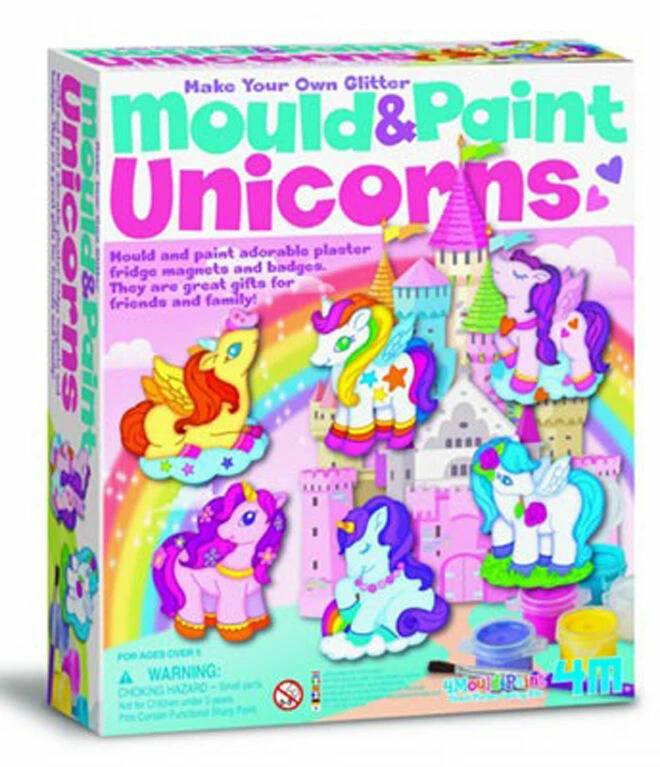 Create up to 6 unicorn-themed fridge magnets or badges with this super-fun kit! They make great gifts for friends and family. Includes mould with 6 designs, plaster powder, magnets, pings, 5-colour paint strip, paint brush, glitter, and detailed instructions. For ages 5 years and up