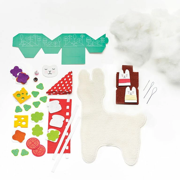 Sew easy, so fun! Stuff, sew and play with your own alpaca friend. Complete the alpacaβs environment by weaving a blanket and building storage for all the sandwich fixings. Includes partially pre-sewn tufted plush faux fur, fiberfill, pre-cut felt shapes, bandana, cardboard stand, 2 painted resin sweets, embroidery floss, needle and threader. Children will enjoy hours of imaginative play and pretend using the printed interior of the retail box which doubles as the alpacaβs land. Finished alpaca measures 33cm W x 16.5cm H x 6.35cm L (13β W x 6 Β½β H x 2 Β½β L).