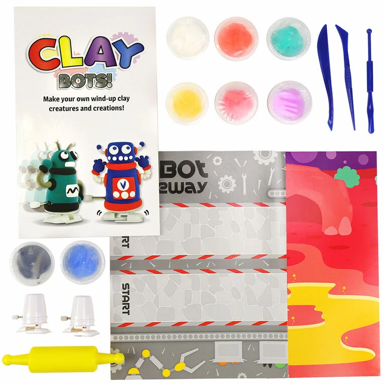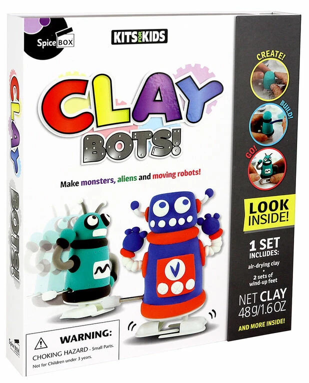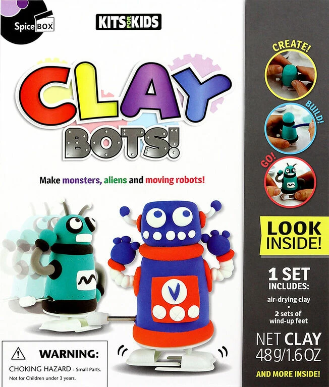SpiceBox Kits for Kids Clay-Bots Make your own wind-up clay creations! Learn how to make wacky aliens, friendly monsters and cool robots. You can even create your own awesome wind-up characters and race them on the fold-out racetrack included! This kit has everything you need to start making cool clay creations as soon as you open the box!