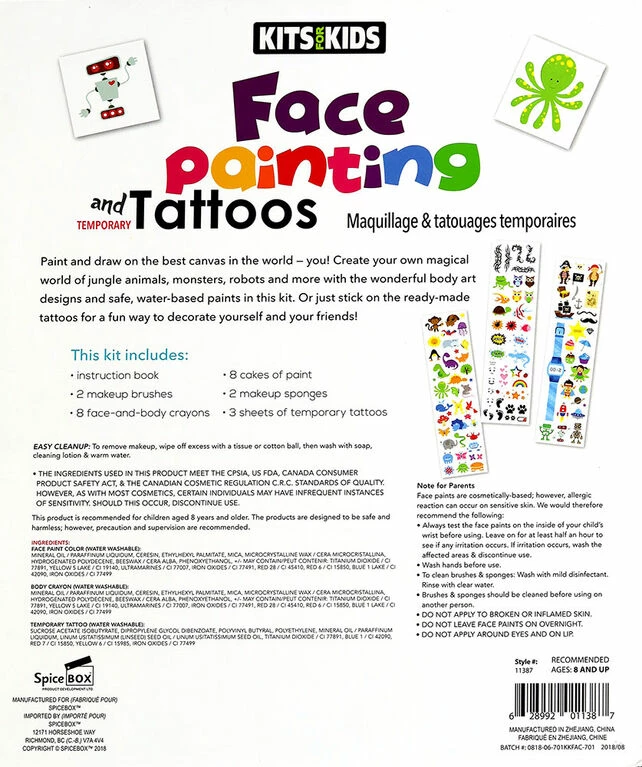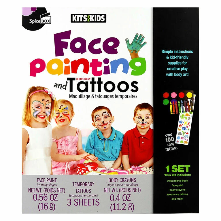 SpiceBox Kits for Kids Face Painting and Tattoos Paint and draw on the best canvas in the world-you! Create your own magical world of jungle animals, monsters, robots and more with the wonderful body art designs and safe, water-based paints in this kit. Or just stick on the ready-made tattoos for a fun way to decorate yourself and your friends!
