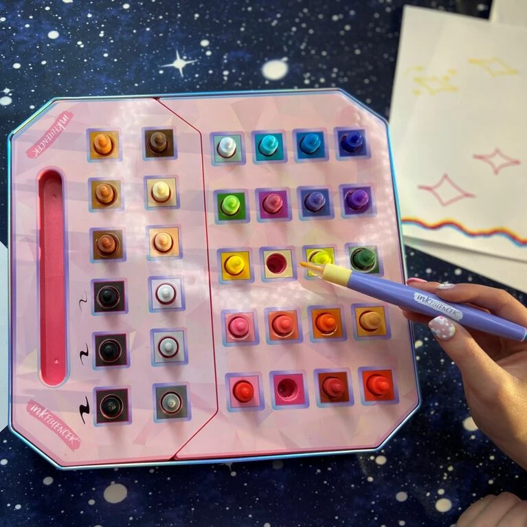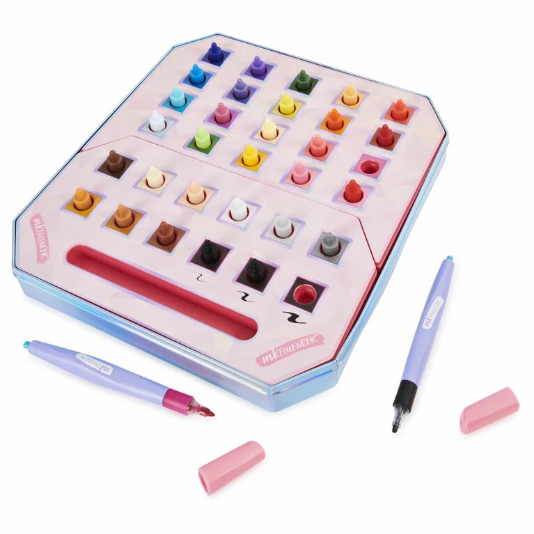 Draw your own fashion-inspired designs with the inkFLUENCER Click N Color Marker Set! Partnering with TikTok influencers We Wear Cute, inkFLUENCER brings you fun, trendy, social media-inspired DIY art supplies. This innovative multi-tip marker set comes with two special inkFLUENCER styluses, 32 marker tips in a variety of colors and a premium storage case! Drawing with the Click N Color Marker Set is as easy as click, connect and create! Choose a color, press one of the styluses down until you hear the tip click in place and unleash your creativity on blank paper! Draw your own outfits, artwork, animals – it’s completely up to you! When you’re finished with a color, simply click the stylus’ button to release the tip back into its spot on the tray. Then, switch colors again and again to complete your drawings. You can even choose from three different black marker tip widths to draw and customize with! When you’re finished drawing, share your pretty artwork online with friends! For easy storage, everything fits inside the cool, crafty reusable premium case. For even more ways to create, look for the inkFLUENCER Style N Create Light Desk (sold separately). Design for days and draw anything you can imagine with the inkFLUENCER Click N Color Marker Set!