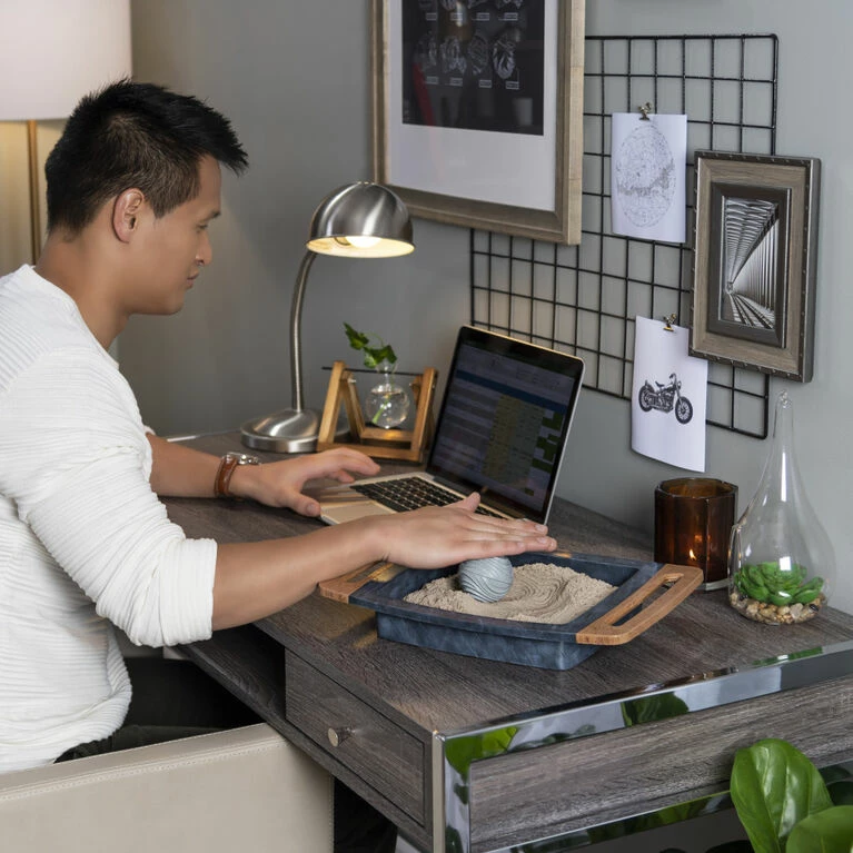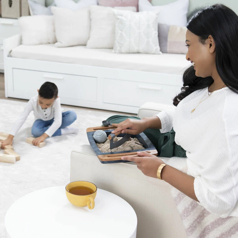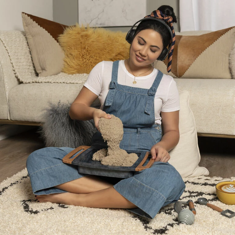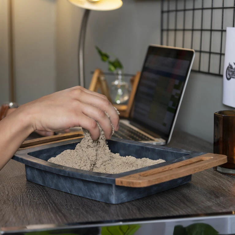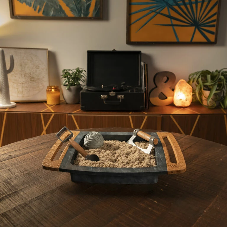 Slice, scoop, roll and relax with the Kinetic Sand Kalm Zen Box! This Kinetic Sand set is the first-ever Kinetic Sand item for adults and comes with everything you need for a satisfying sensory sand experience: 2lbs of Kinetic Sand, three tools and a stylish sandbox! Kinetic Sand is the original moldable and mesmerizing magic sand. It flows through your hands and never dries out, so you can play again and again. The Zen Box is the perfect size for desks and tabletops and provides you with a soothing way to play with Kinetic Sand. Cut and slice through your sand garden with the knife, fill the rolling ball and use it as a mold, then use the 2-in-1 tool’s shape shifter to transform your sand. Scoop sand with the 2-in-1 tool and roll the ball around – with grooves on the ball, it leaves wavy imprints in your sand! The unique Kinetic Sand formula makes it easy to shape and mold anything you can imagine. Create again and again and let Kinetic Sand flow through your hands. It’s so satisfying, you won’t be able to put it down! Featuring a sleek design, this Kinetic Sand Zen Box looks great on coffee tables, desks or anywhere you display it! Relax and unwind with the Kinetic Sand Kalm Zen Box!