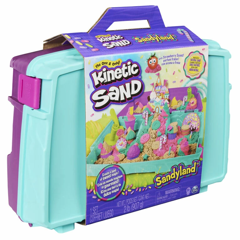 R Exclusive, only available at Toys R Us Canada. Kinetic Sand just got a whole lot sweeter with the Sandyland playset – only available at Toys R Us! Kinetic Sand Sandyland comes with scented and colored Kinetic Sand, including exclusive pink strawberry-scented Kinetic Sand, brown Kinetic Sand, teal Kinetic Sand! Comes with 15+ tools to create your very own Sandyland world! Use the stamps to cut out unique candy shapes, molds to make ice cream, and decorations to turn your sweetest dreams into reality! The only and only Kinetic send is the original, squeezable sensory sand where you can feel the fun. Pack it, pull it, shape it, and love it. Kinetic Sand is kinetic – meaning it sticks to itself, but not your fingers – allowing you to shape and mold create impressive pieces of sand art with detail! Better than arts and crafts modelling clay, its unique formula makes it soft and stretchy, great for touch and sensory play. You can create again and again with Kinetic Sand for hours of tactile independent play. This magic sand oozes, moves and melts right before your eyes, flowing through your fingers like a slow-moving liquid, but leaves them completely dry making clean up super easy. Kinetic Sand never dries out or hardens, so you can create sand art using the moldable sand again and again! Kinetic Sand Sandyland provides a large folding play space for kids to create anything they can imagine. Fold it up for easy storage and clean up! Feel the fun with the Kinetic Sand Sandyland Folding Sandbox.