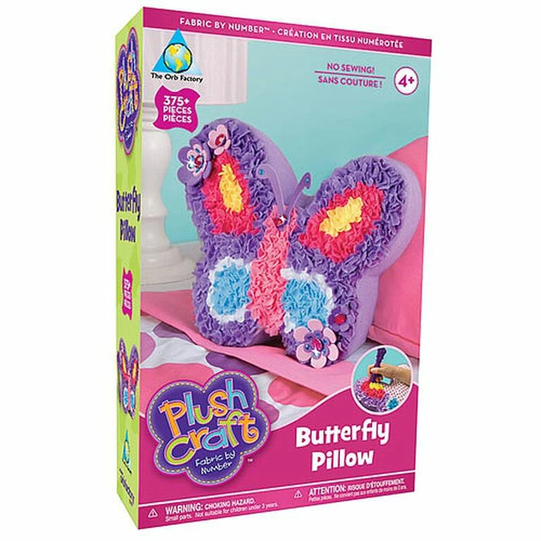 PlushCraft Butterfly Pillow is the exciting craft that becomes a whimsical piece of room decor. Children follow a numbered legend and punch fun fabric pieces into a pillow to create their very own Butterfly pattern. This is a fabric craft that doesn’t require any sewing and promises perfect results every time. Finish your craft by adding pretty foam stickers and sparkling jewel accents. PlushCraft kits allow children to make beautiful fabric crafts completely independently, without having to sew! These high quality pillows result in stunning finished project that children can display proudly for years to come. These kits make perfect birthday presents and are wonderful for travel. The patented punch technology means children can easily fabric-by-number to create a perfect plushy pattern. These crafts teach pattern recognition, hand eye coordination, and install a confidence in crafting.